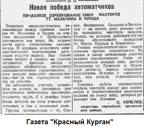 Вот что пишет газета «Красный Курган» за 29.12.1943 г.: «После митинга, посвященного конференции «трех держав», в автоматном цехе смена мастера М. Я. Мяльчика дала наивысшую производительность труда – 116% задания или 200% нормы. Автоматчик Мещеряков дал наивысшую производительность - 275 % нормы, Петушков А. А. – слесарь-инструментальщик – выполнил норму на 150%-200%; Тюленева – штамповщица – выполнила норму на 199%, Литявская – сборщица – выполнила норму на 242%. Группа автоматчиков – Сивков, Мещеряков, Синицын, Васильцов на 8 дней раньше срока выполнили месячное задание».