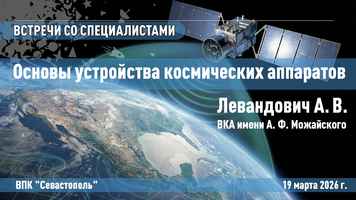 Работу КА сопровождают самые разные неблагоприятные условия (факторы): глубокий вакуум, радиация, метеорная опасность и антропогенное загрязнение, тепловое воздействие, невесомость и другие. У каждого из неблагоприятных факторов свои свойства, которые приходится преодолевать конструкторам КА и применять различные способы защиты КА от таких факторов. КА имеют различное предназначение: военное (связь, навигация, топогеодезия), прикладное (метеорология, наблюдение, фотонаблюдение, оптико-электронное наблюдение, зондирование земной поверхности) и научно-исследовательское (исследование Солнечной системы, исследование околоземного пространства, исследование космических лучей и ЭМ-излучения, медико-биологические, отработка технических процессов, специальные). КА имеют различную массу, габариты, различные рабочие орбиты и траектории полёта т.д. Исходя из предназначения КА имеют различное бортовое оборудование и конструкцию корпуса. Все эти задачи и приходится решать конструкторам космических аппаратов, в том числе специалистам ВКА имени А.Ф.Можайского. Предлагаем участникам презентацию лектора.