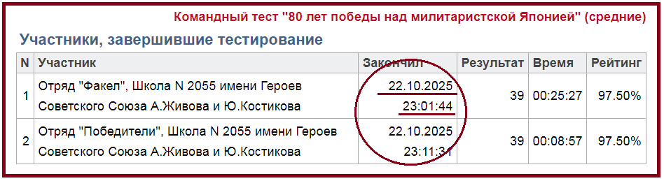 (*) - В случае, если победителями Чемпионата (занявшими призовые 1, 2, 3, 4 и 5 места становятся несколько команд одной организации (учебного заведения), то в число победителей также включаются команды других организаций, имеющие ближайшие к победителям результаты. (Из Правил Чемпионата) Комментарий к итогам Интернет-ЧемпионатаЕсли не считать героев детектива (о которых мы расскажем позже), то первыми на Чемпионате выступил отряд "Правнуки Победы" (г.Пермь). Команда показала высокий результат, но в течение дня все новые и новые команды отодвигали пионеров Чемпионата от призовых мест. Хорошо и комфортно было выступать младшим командам. Конкуренции нет, и все попали в число победителей.... Хотя Отряд "Хранители воинской славы", Отряд "Родина" (ЯНАО), Отряд "Наследники Победы" (Чапаевск, Самарская область), Юнармейский отряд "Подвиг" (г.Воронеж) - опытные бойцы и их вряд ли можно напугать любым числом соперников. Друзья, мы понимаем, что наши уроки и чемпионат сложны для самых маленьких. И мы не можем что-то изменить. Ведь история - это серьезная и взрослая наука. Поэтому пусть ребята участвуют и дальше, но мы надеемся, что руководители помогают нам перевести сложную военную историю с научного "тарабарского" на простой язык младших школьников. Не ходили в школу (на уроки) и не стали участвовать в чемпионате "Казачата Приуралья" (ЯНАО). Видимо казачата не привыкли брать лёгкие призы и решили пропустить этот чемпионат, не смотря на то, что он у них мог быть первым. Среди средних отрядов тоже конкуренция была невысокой, но... в этом случае обидней занимать последние места. Совсем чуть-чуть не повезло отряду "Тайфун" из г. Шадринска (Курганская область). Всего еще бы один правильный вопрос и было бы приятное призовое место. Но не случилось. Остальным командам до победы не хватало значительно больше правильных ответов. Самая большая конкуренция была в старшей группе - 30 команд! Это столько же, сколько команд в остальных группах. Мы искренне рады за новичков - команды "Кадеты-38" (г. Каменск - Уральский, Свердловская область) и "Потомки" (с.Казаркино, Курганская область). Рады и не за новичков - "Наследие" (г. Гродно, Республика Беларусь), "Правнуки победителей", (г. Екатеринбург), Отряд "Батальон N 1" (г. Богородск, Нижегородская область), и помним, что победы у вас уже были. Кроме победителей в рейтинге "старших" с удовольствием отметим команды, которые набрали 80 и более процентов: - Отряд "Север", Ямальская школа-интернат имени Василия Давыдова, Отряд "Катюша", Приозёрная СОШ, Отряд "Камская дружина", Добрянская СОШ N 2, Отряд "Волонтёры Победы Заполярный", Заполярная средняя общеобразовательная школа, Отряд "Наследники Победы", СОШ N 4, Отряд "Наследники победы", СШ им. Краснова В.М. Каждой из этих команд не хватило чуть-чуть удачи, и дай они на один-два правильных ответа больше - любая из команд могла бы претендовать на призовое место. В разновозрастной группе поздравляем все команды: - и не раз побеждавших профессионалов (ВПК "Патриоты", (Новосибирская область), Отряд "Мята", г. Пермь, "Соколята", (Тверская область), и уже бывалую команду "Искатели" (Республика Беларусь), и новичков - Отряд "Тайфун 2" (Курганская область) и "Юнармеец" (Республика Башкортостан). Хотя мы помним, что "Юнармеец" уже ходил на уроки одного из прошлых Интернет-Чемпионатов, но на сам чемпионат почему-то не пришел. И в за